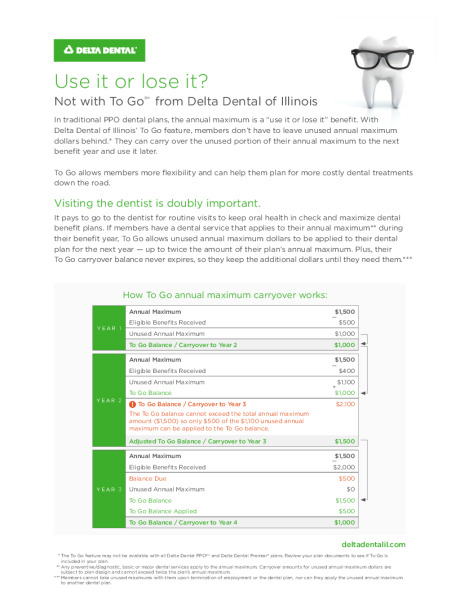 - To Go Carryover Feature – If you have a dental service that applies to your annual maximum during the benefits plan year, To Go allows unused annual maximum dollars to be applied to your dental plan for the next year — up to twice the amount of your plan’s annual maximum. Plus, your To Go carryover balance never expires, so you keep the additional dollars until you need them.
