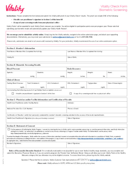 Vitality Form Biometric Screening